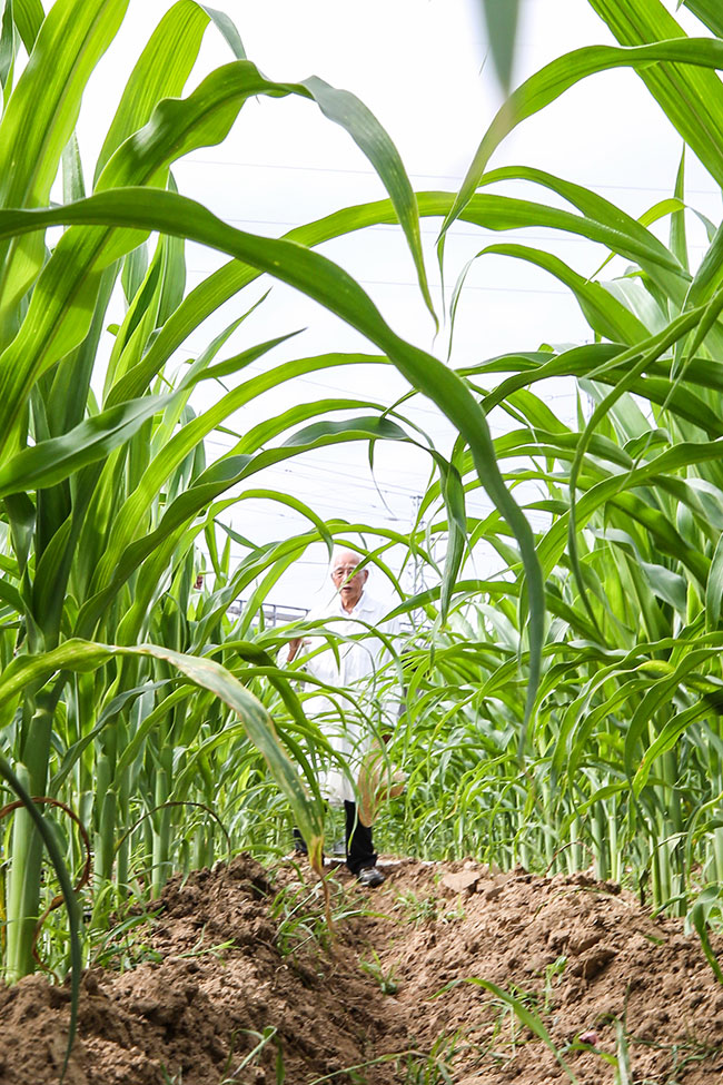 玉米育种专家程相文在海南三亚南繁科研育种基地视察玉米生长情形(2022年12月15日摄)。。。。。。。新华社记者 张丽芸 摄